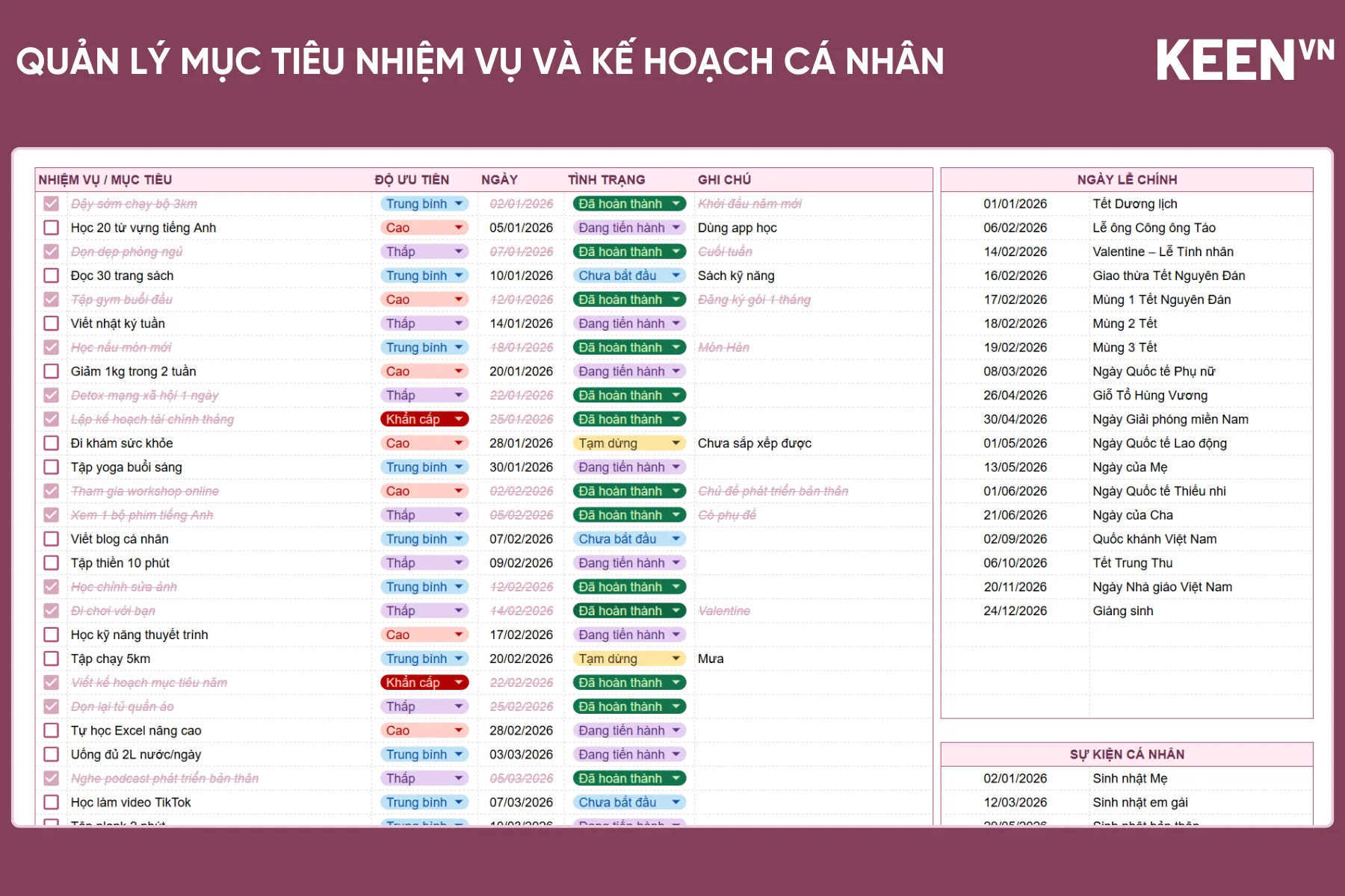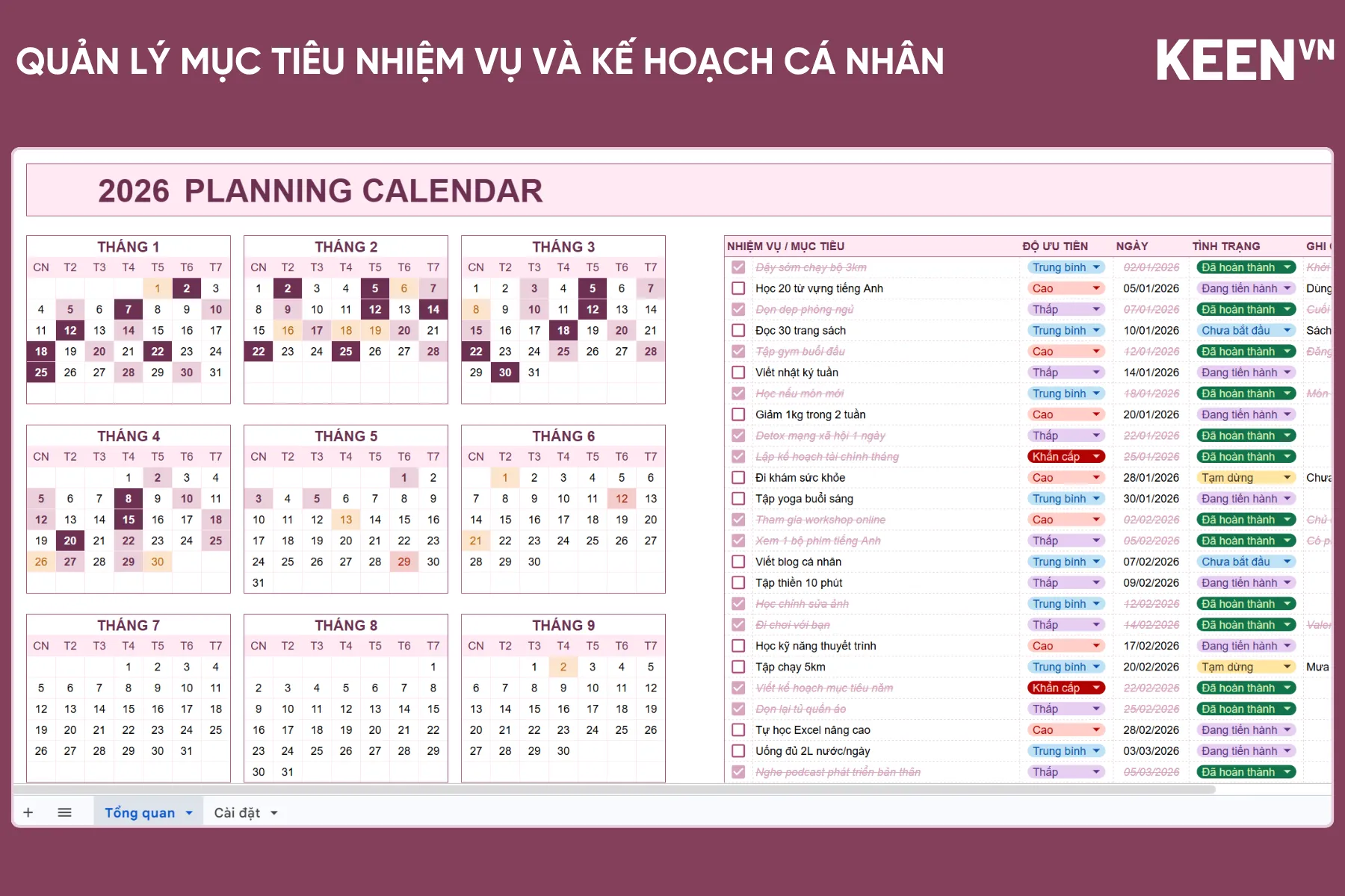 ![[GS-PLAN-019] Bảng quản lý mục tiêu nhiệm vụ và kế hoạch cá nhân kèm lịch Google Sheet [GS-PLAN-019] Bảng quản lý mục tiêu nhiệm vụ và kế hoạch cá nhân kèm lịch Google Sheet](https://keenvn.com/wp-content/uploads/2026/04/GS-PLAN-019-Bang-quan-ly-muc-tieu-nhiem-vu-va-ke-hoach-ca-nhan-kem-lich-Google-Sheet.webp)
